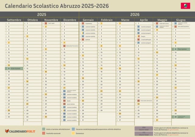 La Regione Abruzzo ha definito il calendario scolastico 2025-2026, stabilendo le date delle vacanze di Natale e Pasqua, così come i ponti distribuiti durante l’anno. Le lezioni inizieranno lunedì 15 settembre 2025 e termineranno il 9 giugno 2026 per le scuole primarie e secondarie, mentre le scuole dell’infanzia continueranno le attività fino a martedì 30 giugno 2026.