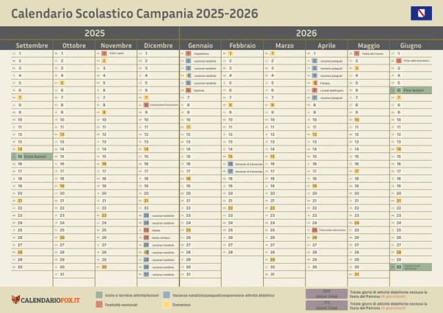 La Regione Campania ha pubblicato il calendario scolastico 2025-2026. Le lezioni inizieranno il 15 settembre 2025 e termineranno il 6 giugno 2026, mentre le scuole dell’infanzia chiuderanno il 30 giugno 2026. Sono previste le vacanze di Natale dal 23 dicembre al 6 gennaio, di Carnevale il 16 e 17 febbraio, e di Pasqua dal 2 al 7 aprile 2026. Gli studenti avranno 203 giorni di lezione (202 se cade il Santo Patrono).