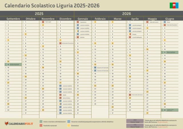 La Regione Liguria ha definito il calendario scolastico 2025-2026. Le lezioni inizieranno il 15 settembre 2025 e termineranno l’11 giugno 2026 (il 30 giugno per le scuole dell’infanzia).