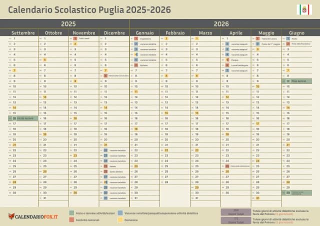 Scarica gratis il calendario scolastico 2025–2026 Puglia in PDF A4 con design minimalista e colorato. Le lezioni iniziano il 16 settembre 2025 e terminano il 9 giugno 2026 (il 30 giugno per le scuole dell’infanzia), per un totale di 203 giorni di scuola e 221 per l’infanzia. Include le 11 festività nazionali e i giorni del santo patrono per Bari, Foggia, Lecce e Taranto. Disponibile per la stampa in formato verticale o orizzontale.