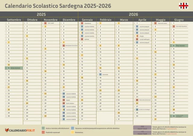 Scarica gratis il calendario scolastico 2025–2026 Sardegna in PDF A4 con stile minimalista e colorato, Made in Italy. Le lezioni iniziano il 15 settembre 2025 e terminano l’8 giugno 2026, per un totale di 204 giorni di scuola (203 se cade il Santo Patrono).