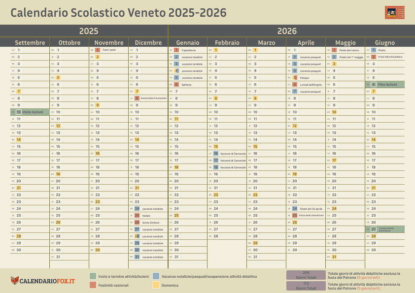 Calendario scolastico 2025-2026 Veneto da stampare PDF