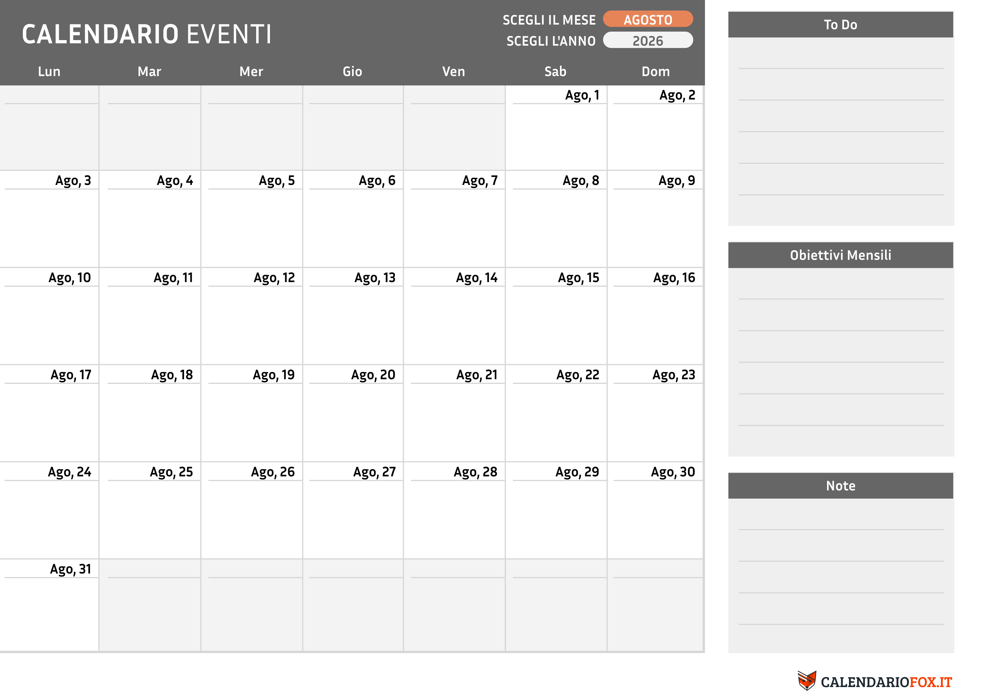 Rimani organizzato e produttivo con il nostro Calendario Annuale 2026 con Festività Italiano. Il nostro design include 12 giorni festività evidenziate in rosso. Sotto il calendario c'è spazio per annotare i tuoi appunti.