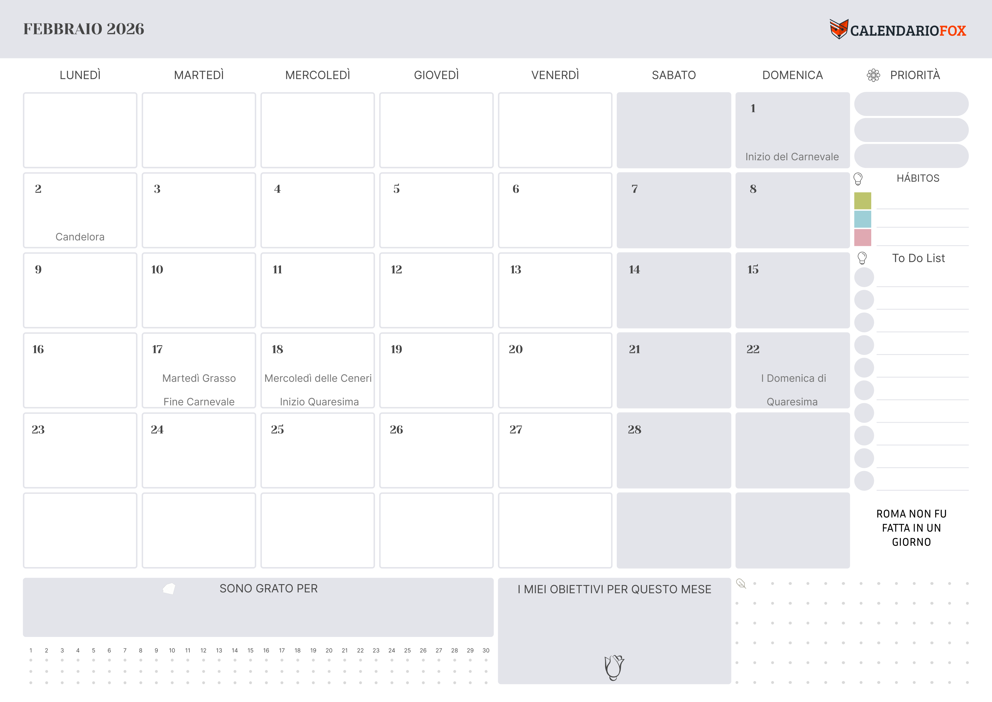 Il Calendario di Febbraio 2026 di CalendarioFox combina design minimalista e funzionalità. Include festività come la Candelora, il Carnevale, il Mercoledì delle Ceneri e l’inizio della Quaresima. Ideale per pianificare obiettivi, abitudini e liste To-Do mensili.