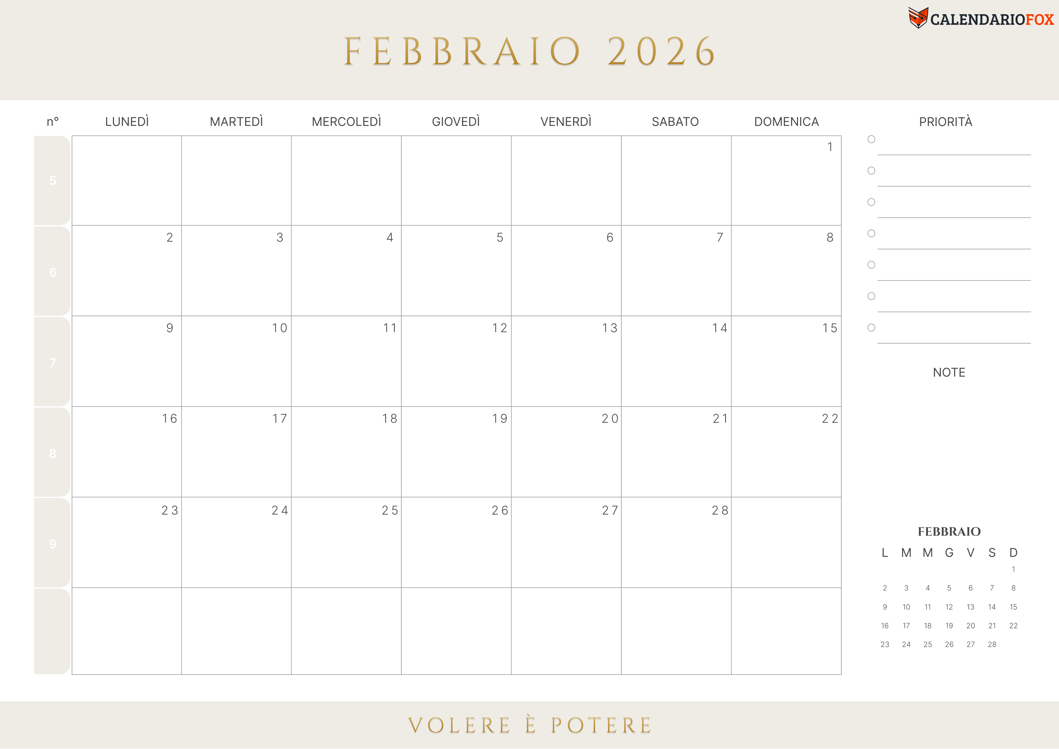 Il Calendario Febbraio 2026 di CalendarioFox offre una pianificazione chiara del mese, con spazi dedicati a priorità e note per organizzare impegni e obiettivi. La mini panoramica mensile e il motto motivazionale “Volere è Potere” ispirano una gestione efficace delle settimane, dall’1 al 28.