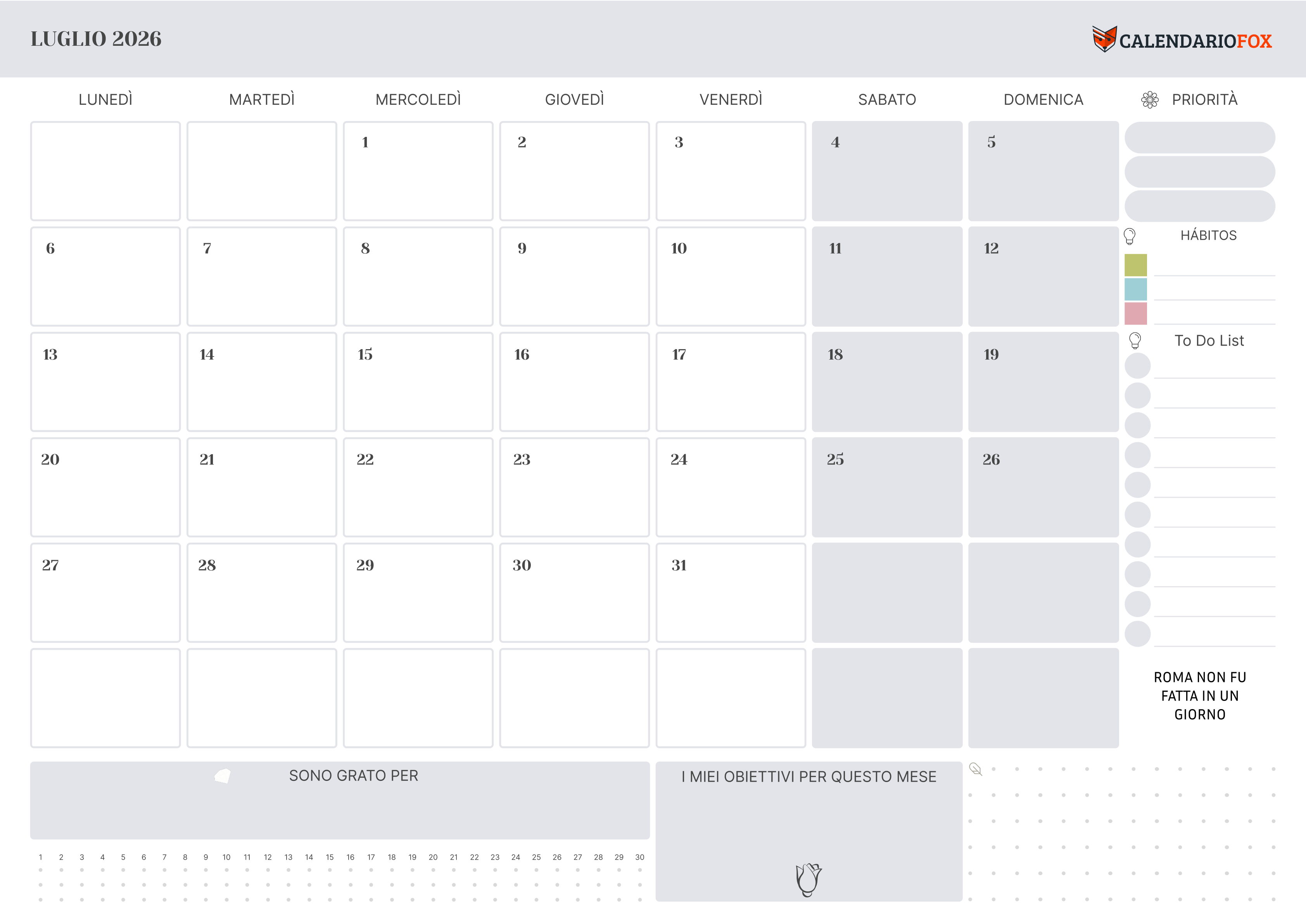 Il CalendarioFox Luglio 2026 offre una chiara panoramica del mese, con spazi dedicati a priorità, abitudini e to-do list. Ogni giorno è ben definito, mentre in basso si trovano sezioni per riflettere su ciò per cui si è grati e sugli obiettivi mensili. Perfetto per pianificare con consapevolezza.