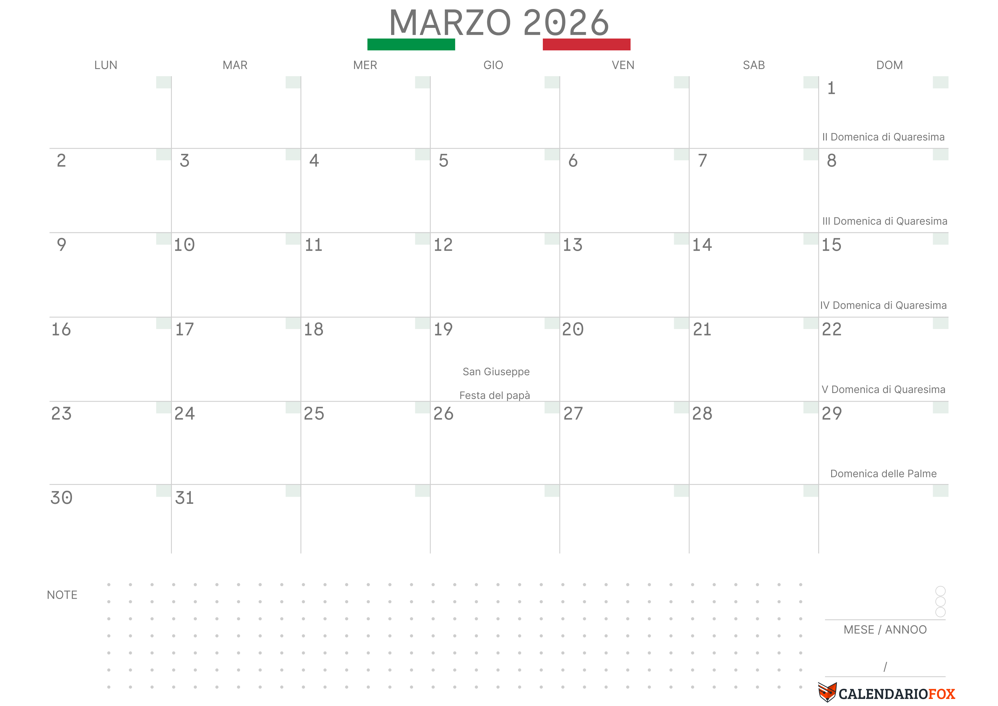 Rimani organizzato e produttivo con il nostro Calendario Annuale 2026 con Festività Italiano. Il nostro design include 12 giorni festività evidenziate in rosso. Sotto il calendario c'è spazio per annotare i tuoi appunti.
