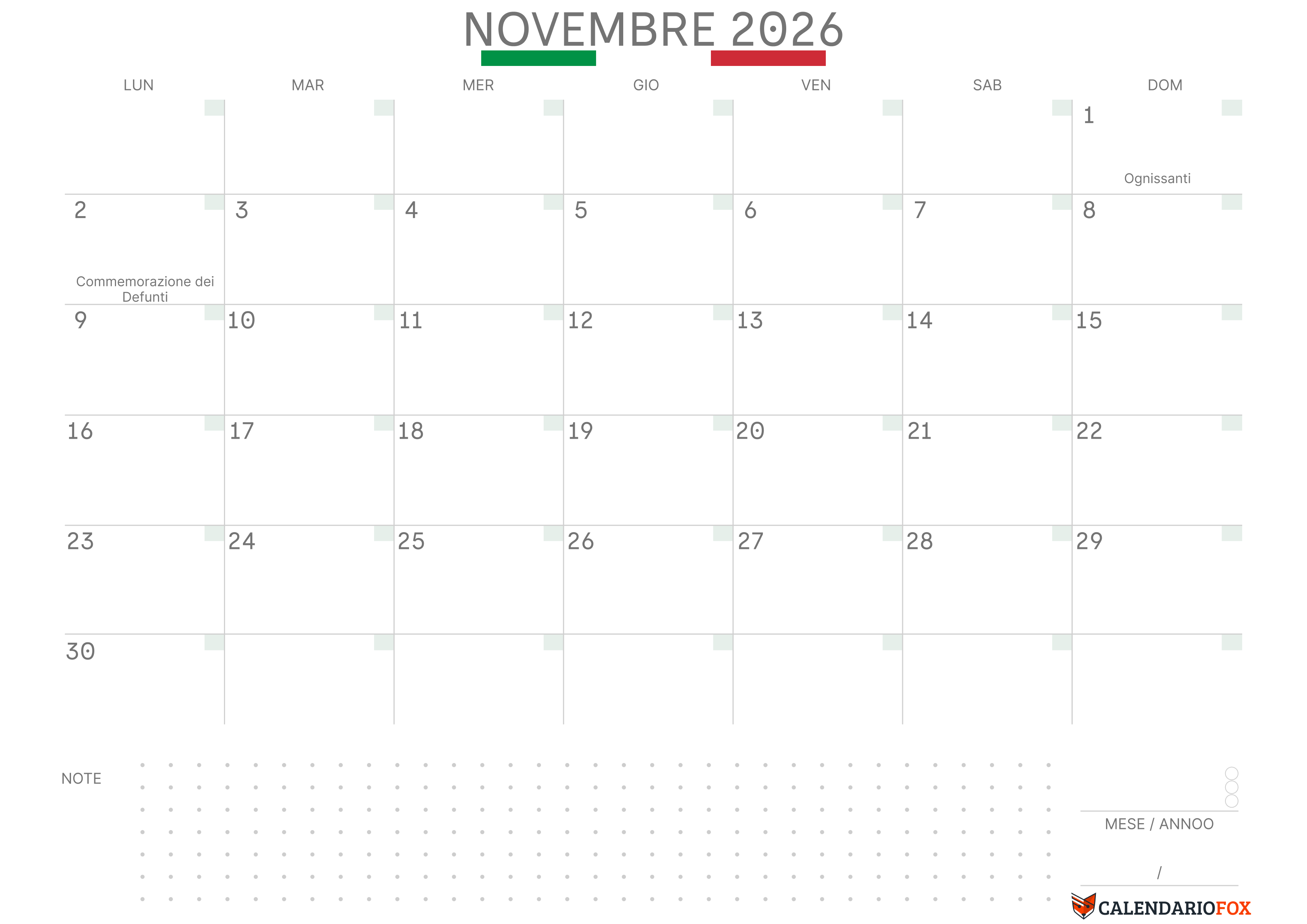 Rimani organizzato e produttivo con il nostro Calendario Annuale 2026 con Festività Italiano. Il nostro design include 12 giorni festività evidenziate in rosso. Sotto il calendario c'è spazio per annotare i tuoi appunti.