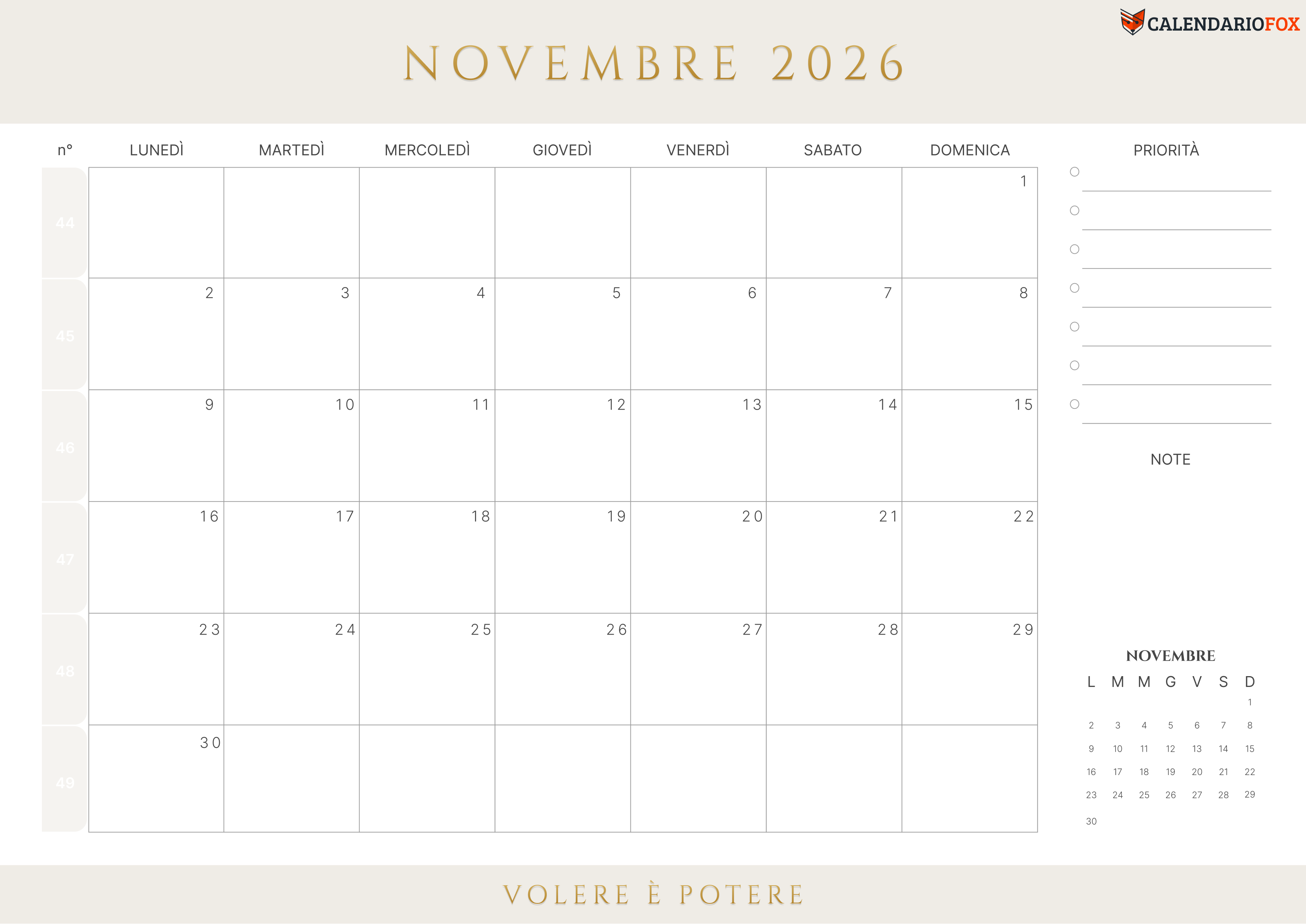Il calendario Novembre 2026 di CalendarioFox combina eleganza e funzionalità. Ogni giorno del mese è ordinato e ben visibile, con spazi per priorità e note personali. Il motto ispiratore “Volere è potere” ricorda l’importanza della determinazione quotidiana.