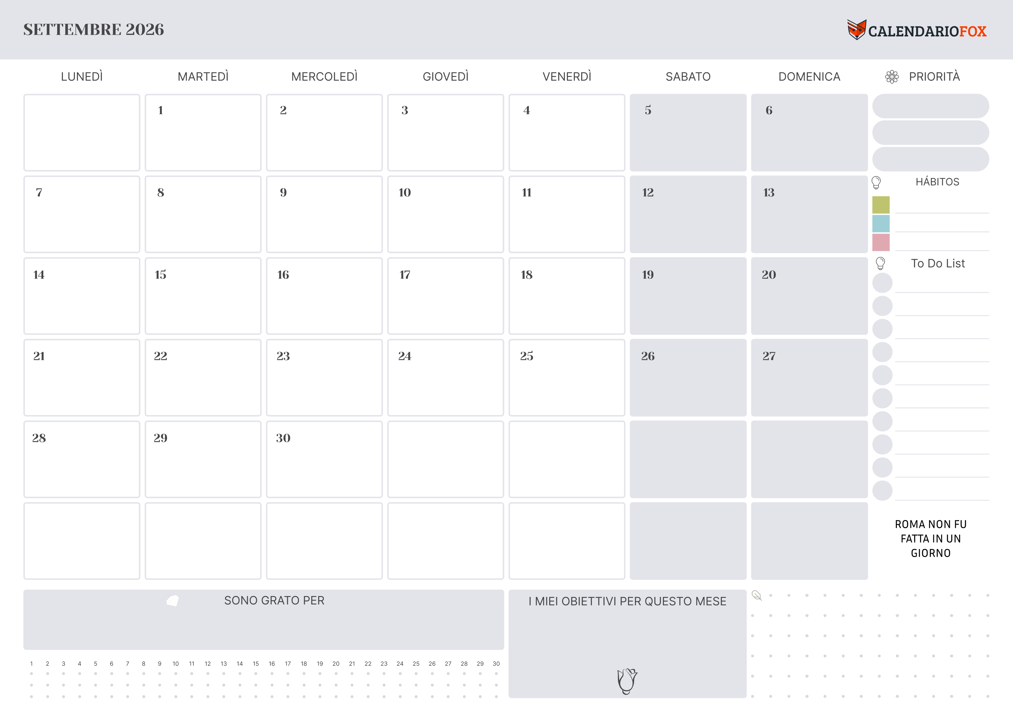 Il CalendarioFox Settembre 2026 accompagna il ritorno alla routine con chiarezza e metodo. Spazi per priorità, abitudini e to-do list aiutano a organizzare il mese. Le sezioni “Sono grato per” e “I miei obiettivi per questo mese” favoriscono equilibrio e motivazione quotidiana.